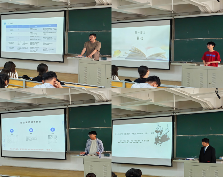 本次分享会还从2024届毕业生中邀请了四位优秀朋辈榜样做了分享。麻琨同学结合自身考研经历,从择校情况、备考方法、时间安排、心态调整等方面进行分享;周明健同学从个人情况出发,讲述了考研择校、考研常用资源、考研常见困难及应对措施、考研调剂注意事项、个人感悟几个方面,用自身经历告诉学弟学妹们,考研不仅是一场知识的较量,更是一场心态和信息差的考验,面对挑战时保持一颗平常心至关重要。邢紫硕和张文堂两位同学从招聘信息获取、简历制作、简历投递、面试技巧、个人就业感悟等方面与学弟学妹们分享了他们的求职经验,鼓励大家要珍惜大学时光,明确奋斗方向,早日制定适合自己的职业规划。