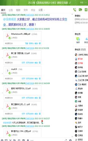 (1)根据2021年10月下旬该课程线上教学经验,本学期改为全程直播授课(除部分上机学时外)。根据我校整体教学部署,及时建立了课程QQ群,课程专用腾讯会议号;及时将教学大纲、软件安装步骤,教材案例操作过程,发到课程QQ群,供学生下载学习。帮助学生安装R语言软件并确保软件的运行效果,并做好直播准备。