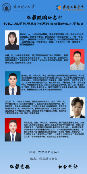 为进一步加强学风建设,引导新生更快适应大学生活,树立正确的世界观、价值观和人生观,掌握更为科学合理的学习方法以及养成良好的生活习惯。11月26日晚,机电工程学院在腾讯会议举办“弘毅鲲鹏励志行”——新生入学教育朋辈引领活动。学院21级辅导员刘炜琪、梁雪洁,机电学院朋辈引领团成员以及21级全体新生参加了本次会议。