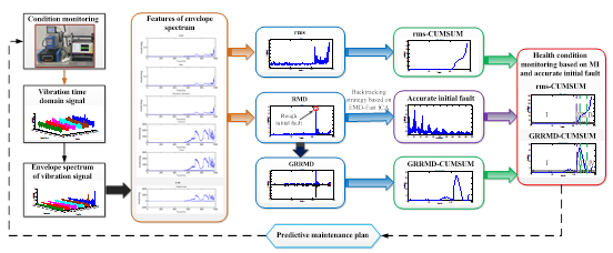 该文基于监测的振动信号,利用了包络谱统计特征构建了rms-CUMSUM指标来反映轴承实时性能退化趋势;同时合成了实时马氏距离,研究速率变化趋势,得到了实时反映轴承性能退化速率的GRRMD-CUMSUM指标;根据回溯追踪策略确定的初始故障点和GRRMD-CUMSUM的特征点,将轴承性能退化过程分为正常、初始故障、严重故障和完全失效四个阶段,并通过IEEE Prognostics and Health Management (PHM) 2012 Prognostic Challenge和辛辛那提大学智能维护系统中心(IMS)的公开数据进行了验证,表明利用轴承性能退化速率变化能够对其进行阶段划分。