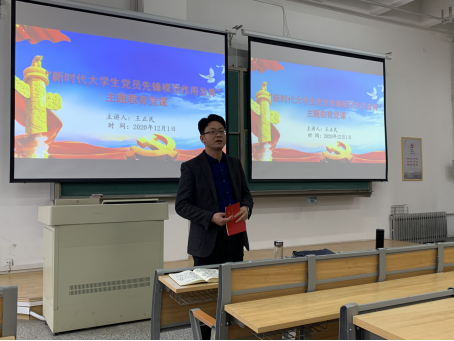 随后学院党委书记王正民,以“新时代大学生党员先锋模范作用发挥”为题,为党员们做主题教育党课。党课从“新时代”讲起,依据“新时代”的提出背景和要求,强调学生党员们应该牢记“四个自信”、“四个意识”、“两个维护”,这是身为一名党员应该深刻认识的深度践行的。讲到此处,王正民拿出党章,提醒同学们要重视对党章的学习,并且要将对党章的学习作为“三会一课”的学习重点,也作为今后党员理论教育工作的重要着力点。