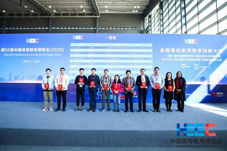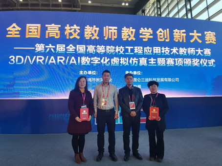 2020年11月10日,由中国高等教育学会主办的全国高校教师教学创新大赛——第六届全国高等院校工程应用技术教师大赛3D/VR/AR/AI数字化虚拟仿真主题赛项全国总决赛颁奖典礼在长沙第55届中国高等教育博览会上顺利举办。我校机电工程学院三个团队喜获全国总决赛一等奖1项,二等奖2项,分别是T1-3D打印与3D设计赛项全国总决赛一等奖(李海燕、康永平、陈卫华、任丽娜、吴卓)、二等奖(魏兴春、宋波),T3-面向实训实践的VR创新应用赛项全国总决赛二等奖(郑敏、李海燕、任丽娜、吴卓、周兰)。