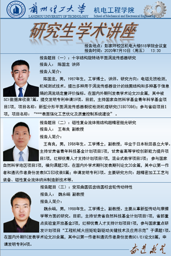 7月10日下午,机电学院在彭家坪校区机电大楼308会议室举行了研究生学术讲座。学院安宗文院长、剡昌锋研究员和冯瑞成副教授和50多名研究生参加了讲座;智能制造工程系魏永峭博士、王有良博士和机电系陈国龙博士在讲座中分享了各自的研究内容,并与研究生开展了讨论。陈国龙博士分享了“十字结构旋转场平面涡流传感器研究”,王有良博士分享了“磁性复合流体微结构超精密抛光研究”,魏永峭博士分享了“变双曲圆弧齿线圆柱齿轮传动特性”。