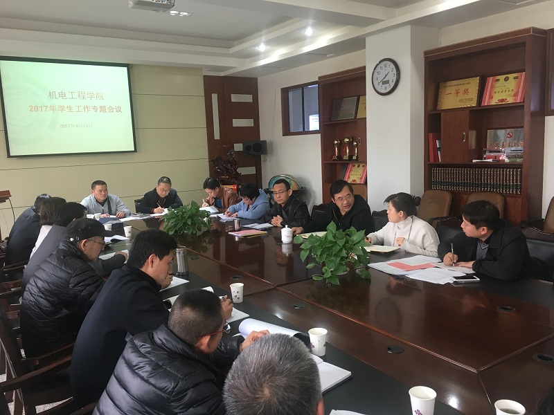 4月11日下午,机电学院在学院会议室召开学生工作专题会议,学院龚俊院长,党委张君书记,魏虹副书记及部分系部主任,全体班主任、辅导员参加了会议。会议由学生办公室王翀主任主持。