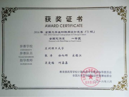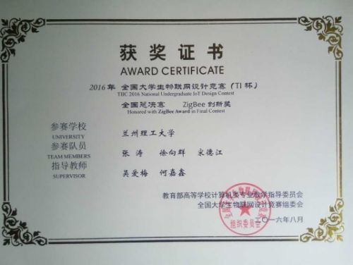 由国家教育部高等学校计算机类专业教学指导委员会主办,全国物联网领域唯一的学科竞赛“2016 TI杯全国大学生物联网竞赛”,决赛8月24日到27日于西安交通大学落下帷幕。本次大赛自3月份开赛以来,历时6个月,来自全国300所高校的1500支队伍经过激烈的角逐,机电学院“3J”科创协会张涛,付开磊,徐向群等同学组成的“3j旗舰队”凭借其作品“基于ZigBee的风机塔筒清洗机器人”一路披荆斩棘,先后获得兰州理工大学物联网设计大赛一等奖,大学生物联网竞赛西北赛区特等奖,并最终在全国总决赛中斩获全国一等奖以及唯一一个组委会“ZigBee创新奖”。
