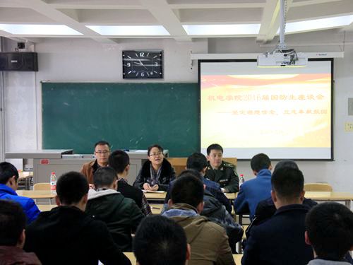 12月10日,机电学院在校本部1南101教室召开了以“坚定理想信念·立志奉献报国”为主题的2016届国防生座谈会。