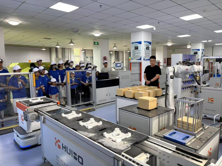 随后在智能包装单元,工业机器人就像是一个个“超级工匠”,能够根据预先设定好的程序,将包装盒放置于包装工作台上,再拾取产品放置于包装盒内,最后吸附包装盖完成包装作业。同学们目不转睛地盯着包装工作台,看着原本分散的不同产品、零部件在机器人的操作下,快速完成了包装,心中充满了对科技的敬畏和赞叹。