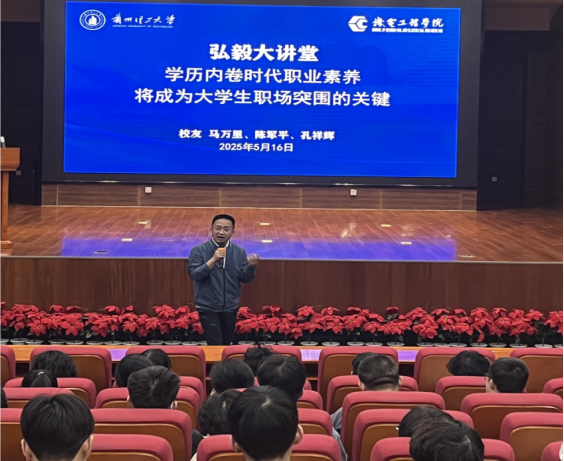活动现场,马万里校友结合自身从技术员到企业高管的职业发展路径,通过多个生动的项目攻坚案例,向同学们强调了如何在职场中敢于担当、勇于创新。他的分享不仅让同学们对职场有了更加深刻地认识,也为他们未来的职业发展指明了方向。