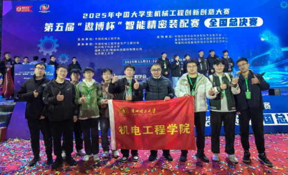 11月21日-22日,2025年中国大学生机械工程创新创意大赛、第五届“遨博杯”智能精密装配赛全国总决赛在杭州落下帷幕。本届大赛以“装配融巧思,智能创未来”为主题,吸引了全国160余所高校近800支队伍参赛,85所高校的245支队伍晋级总决赛,规模创历届之最。机电工程学院陈国龙副院长带队,选派在省赛中荣获一等奖的4支优秀队伍参赛。经过激烈角逐,机电学子凭借扎实的专业基础和出色的创新能力,最终斩获全国二等奖1项、三等奖3项的优异成绩,展现了我校学子在创新型工程人才培养方面的显著成效。