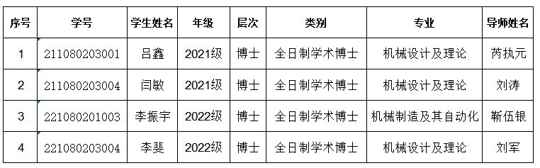 学术能力水平是博士学位授予标准基本要求。根据《兰州理工大学学位授予实施细则》要求,博士学位申请人申请学位前需在导师指导下完成一定科学研究工作,取得与博士学位论文相关的科研成果。 经2025年12月1日机电工程学院学位评定分委会会议审查通过, 建议授予以下研究生工学博士学位: